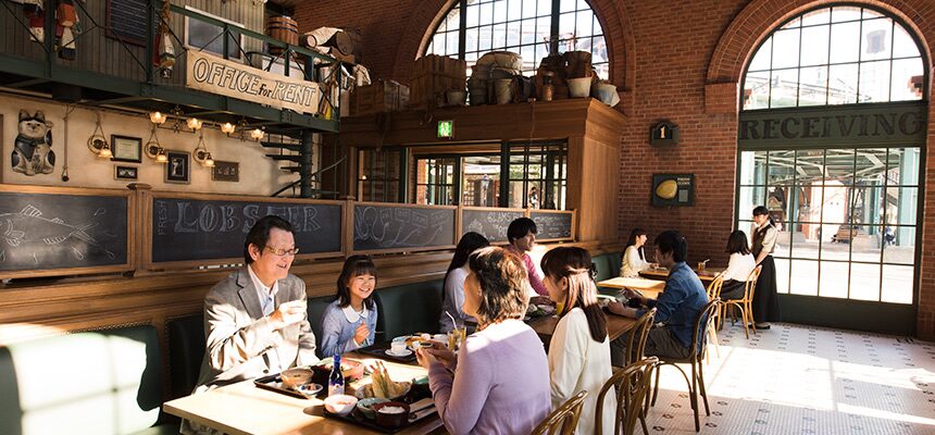 テラス席や窓側席からはハーバーのショーが見られ、食事とエンターテインメントを同時に楽しめる。明るく開放的な店内は、家族連れにも快適。