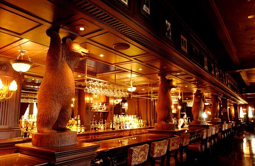 船内のラウンジを思わせる重厚な木製家具と暖炉風の装飾が、大人の隠れ家感を演出。アトラクションの喧騒から離れて、静かなひとときを楽しめます。
