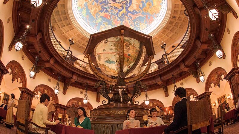 ディズニーシーで最も高級感のあるレストランで、探検家たちの秘密の集会場をテーマにしたレストランです。巨大な地球儀が中央に鎮座する店内は、ルネサンス時代の雰囲気漂う重厚な空間。落ち着いた照明とクラシカルなインテリアが、日常を忘れさせる特別なひとときを演出します。